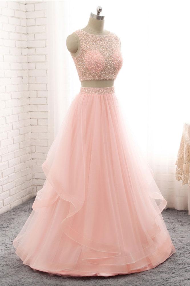 Description for this TWO PIECES BEADS TULLE LONG PROM DRESS, PINK EVENING DRESS,A Line Top Beading Two Piece Long Tulle Prom Dress.