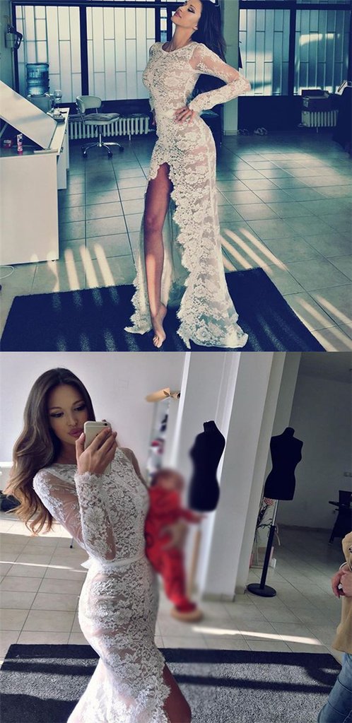 Lace Long Sleeves Side Split Mermaid Sexy Prom Dresses, Wedding Dresses,Sexy Sheath White Lace Long Sleeves Evening Dress