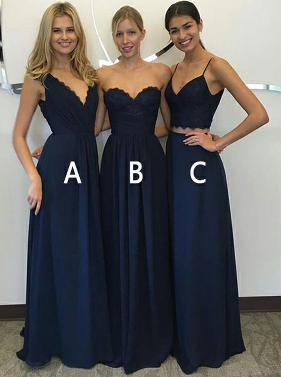 Navy Two Pieces Prom Dress with Lace Applique,Blue Mismatch Bridesmaid Dress