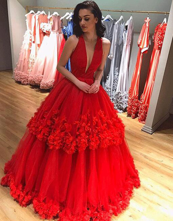 Sexy Ball Gown Deep V-Neck Sleeveless Red Long Prom/Evening Party Dress With Appliques