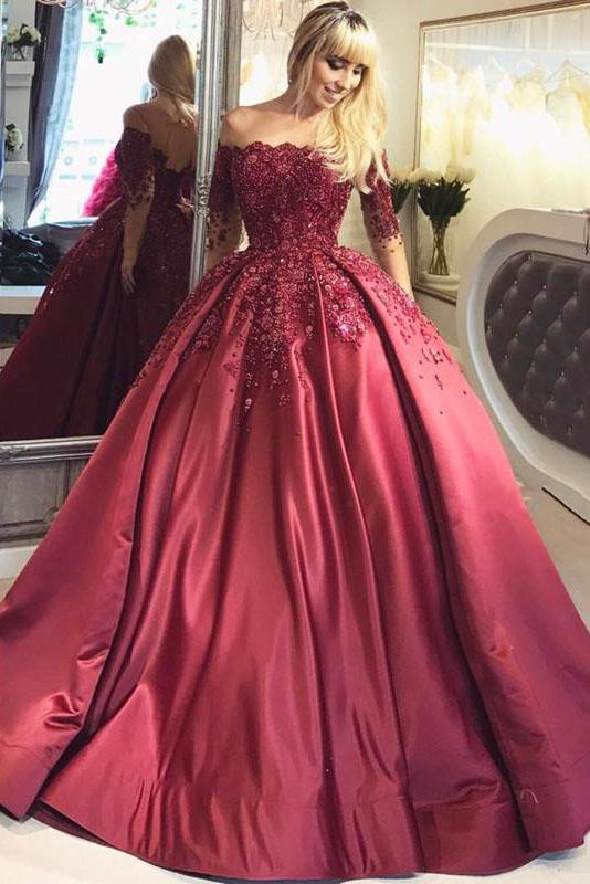 Dark Red Lace Long Sleeve Prom Dress,Off-the-Shoulder Ball Gown Quinceanera Dress