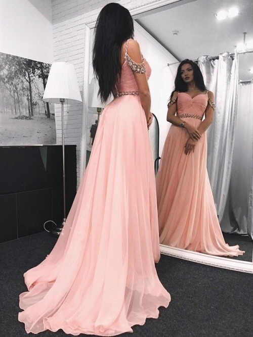Off Shoulder Beaded Sleeve Pink Chiffon Prom/Evening Dress