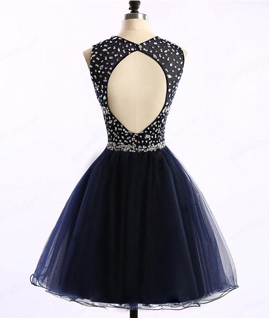 High Quality Round Neck Jeweled Navy Short Tulle Prom/Homecoming Dress,Open Back Navy Tulle Homecoming Dress