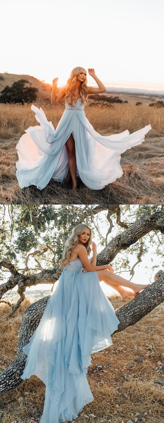 Chiffon Prom Dresses Long, Spaghetti Straps V-NeckHoliday Prom Dresses, Sexy Backless Prom/Evening Dress with Slit