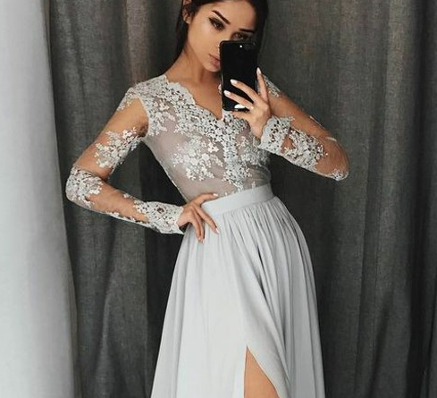 Description for this Long Sleeves Light Grey Chiffon Prom/Evening Dress with Appliques.