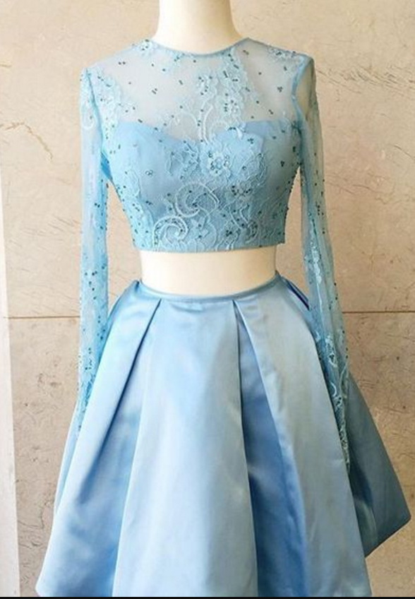 Description for this Two-Piece Light Sky Blue Long Sleeves Short Homecoming Dress .