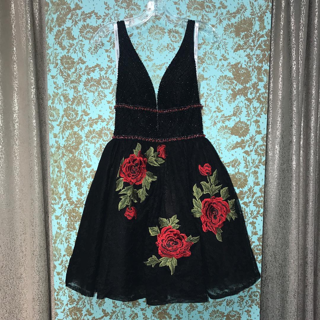 Description for this Black Lace Short Homecoming/Prom Dress with Embroidery.