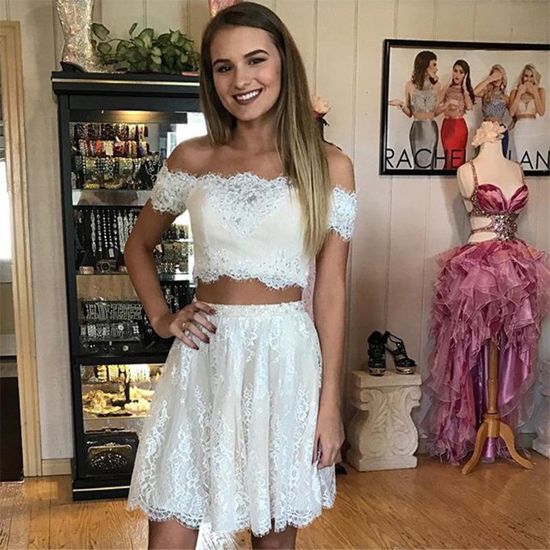 Description for this Off Shoulder Two Pieces White Lace Homecoming Prom Dress.