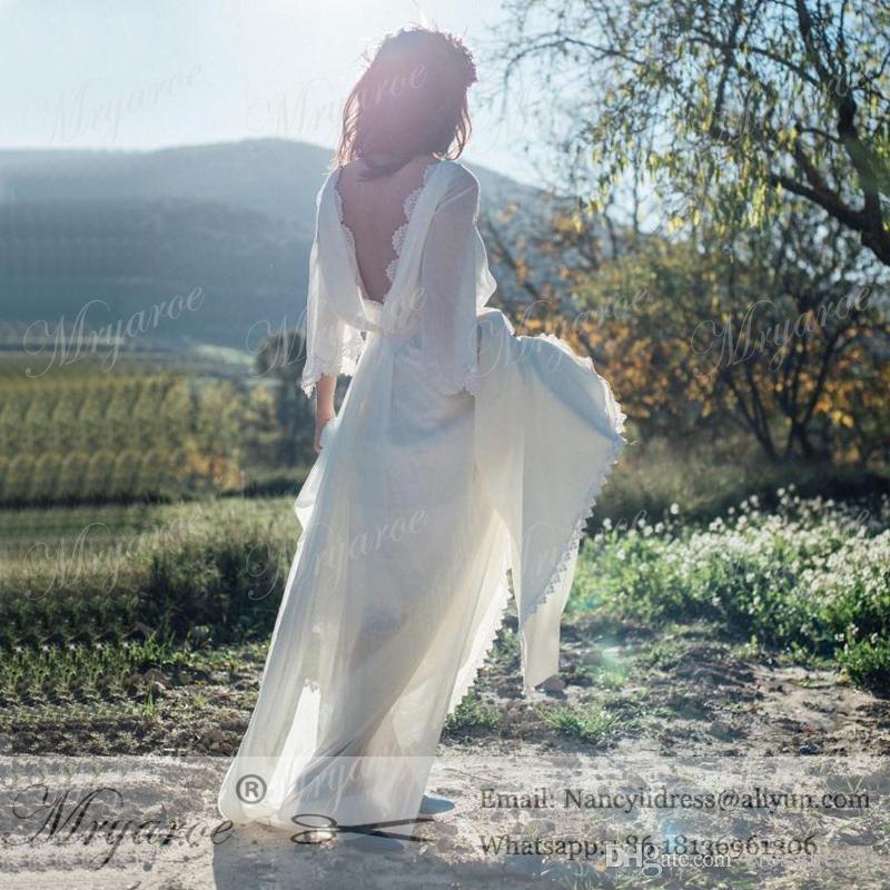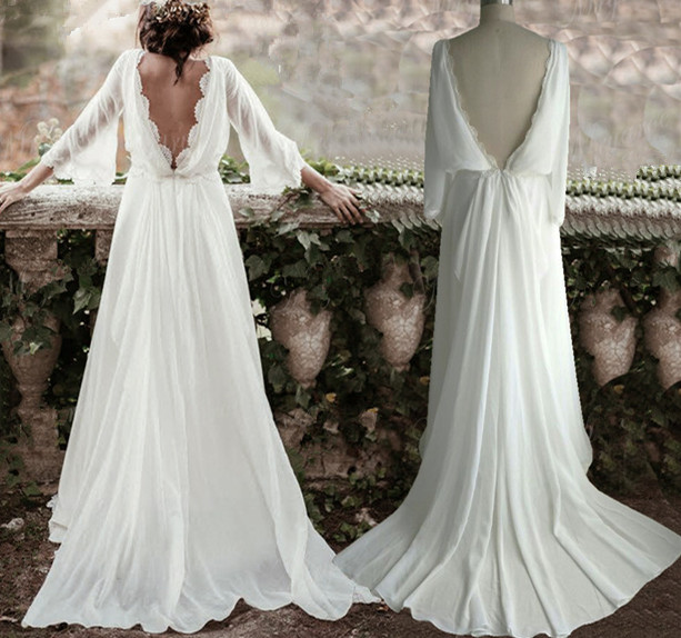 Lace Backless Wedding Dress,Vintage Wedding Dress,Long Sleeve Bridal Gown,Backless Prom Dress,V Back Lace Chiffon Wedding Dress