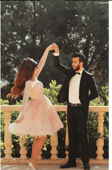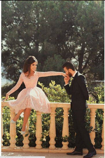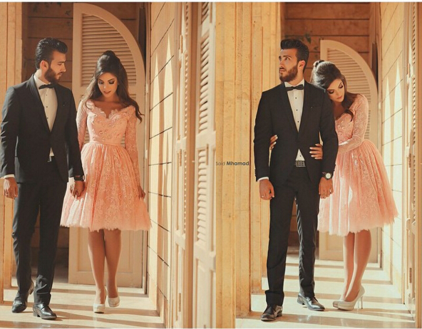 Blush Pink Lace Prom Dress A-line Sheer Lace Knee-length Long Sleeve Prom/Homecoming Dresses Party Dress