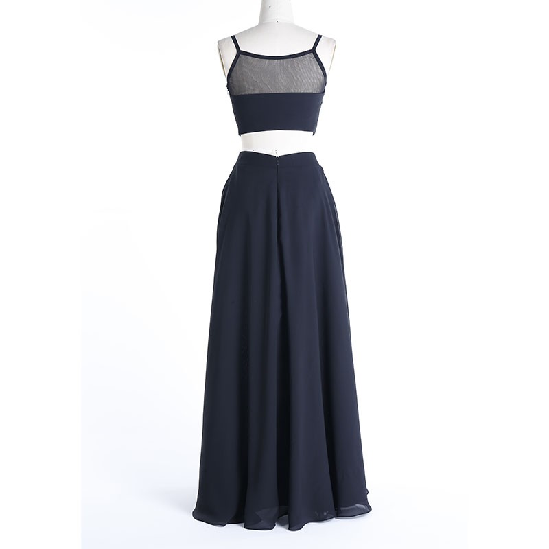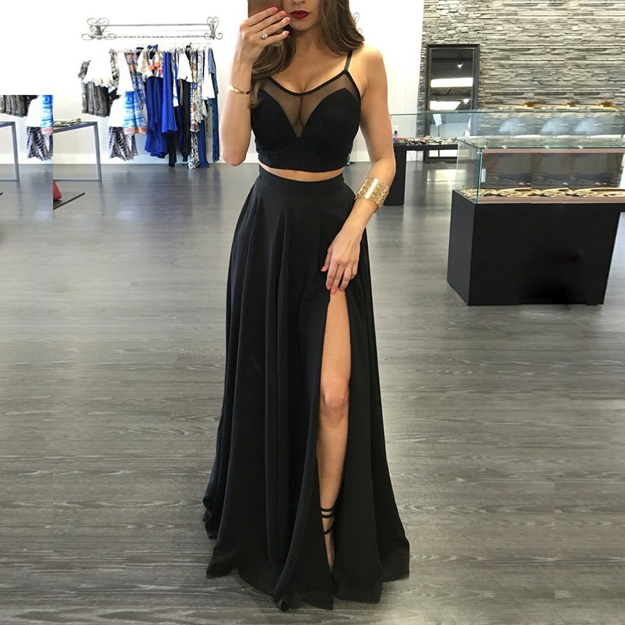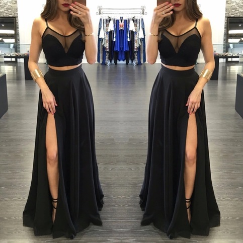 Sexy two pieces black long chiffon prom dress, two pieces side split chiffon evening dress