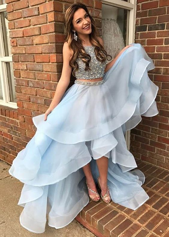 Light blue two pieces high low prom dress,two pieces homecoming dress