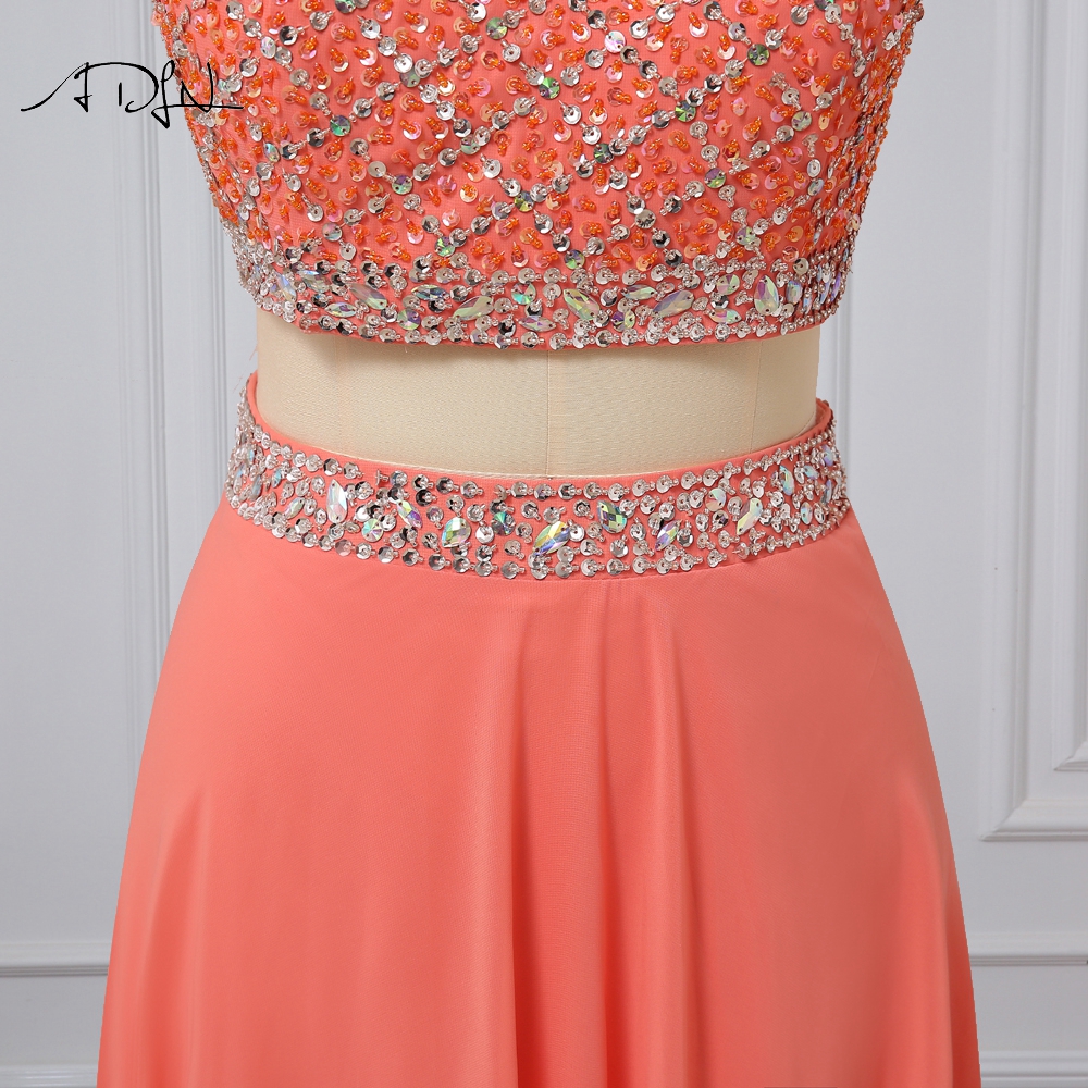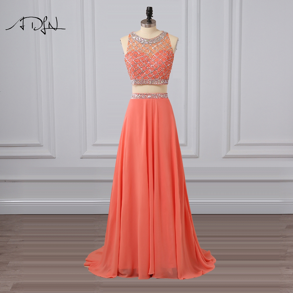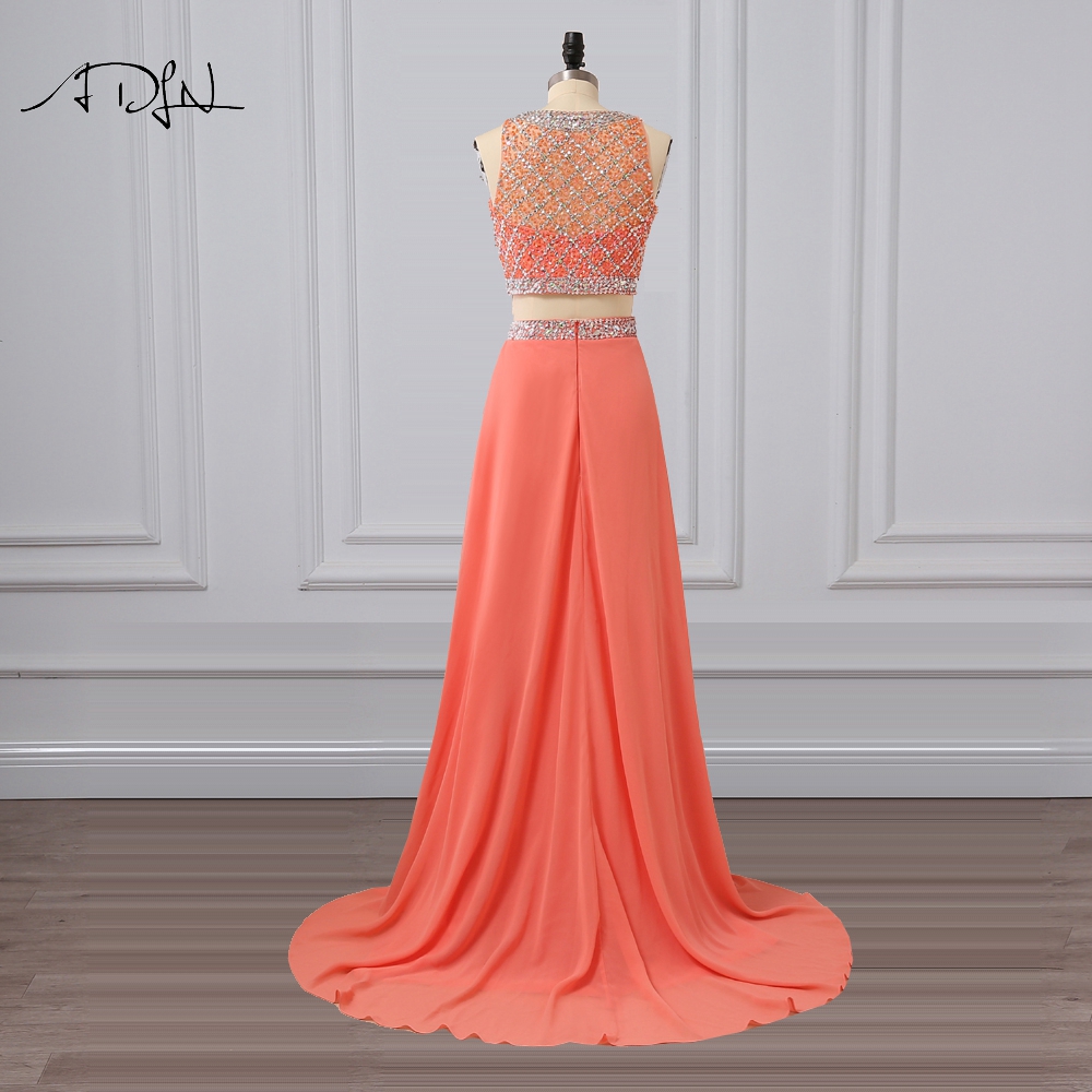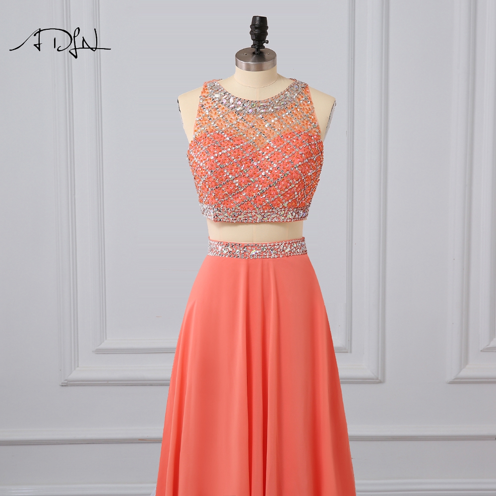 Rush order: within 15 days, please add $30.00 rush order fee, this cost is paid for prior shipping and sewers who would like to work extra time to finish this Two Pieces Beaded Top Long Chiffon Prom Dress.