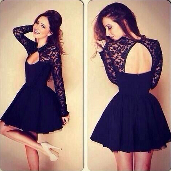 Little Black Dress,Black Short Prom Dress,Long Sleeve Short Open Back Lace Prom/Homecoming Dress