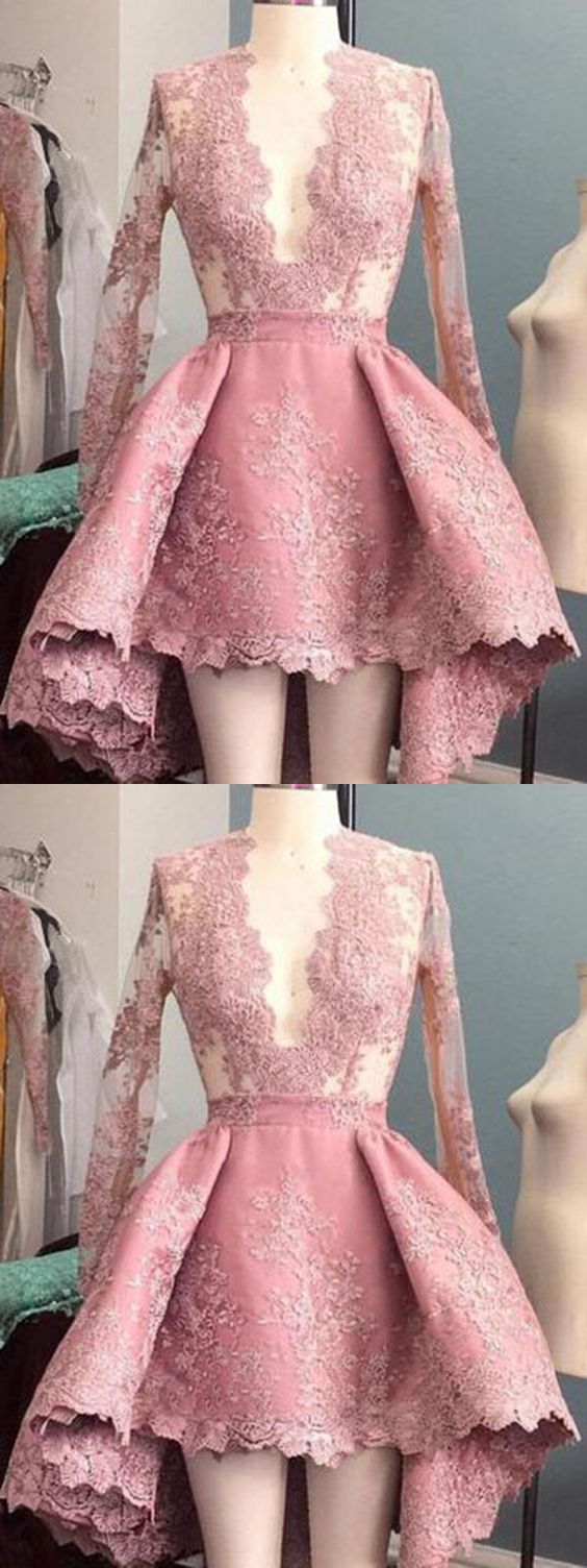 Long Sleeve High Low Lace Homecoming Dress,Long Sleeve Short Lace Evening Gown