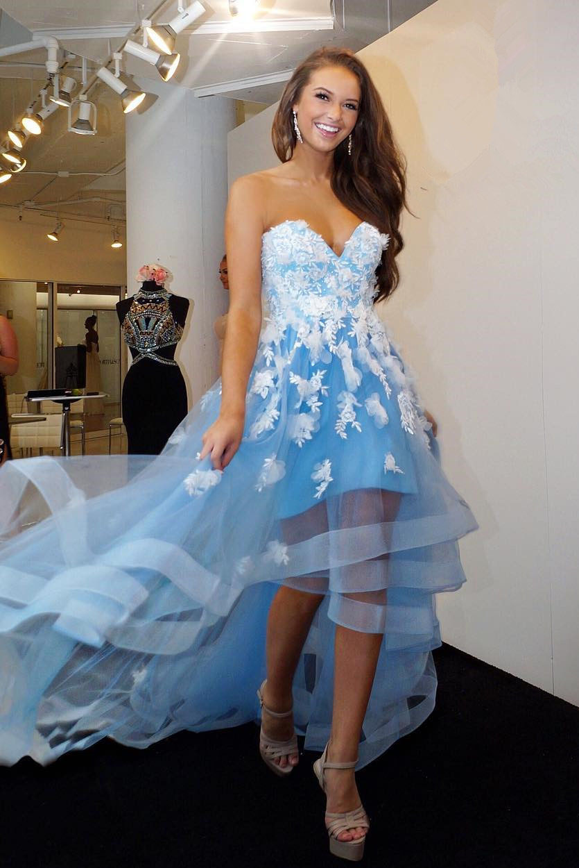 Description for this Sweetheart Light Blue High Low Prom Dress with White Lace.