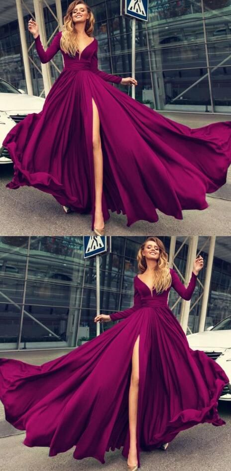 Description for this V Neck Long Sleeve Purple High Split Long Formal Prom Evening Gowns for Women .