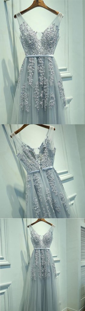 Elegant V-neck Low Back Lace Prom Evening Dress,Grey Lace Bridesmaid Dress