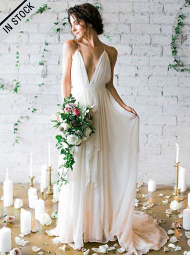 Rush order: within 15 days, please add $30.00 rush order fee, this cost is paid for prior shipping and sewers who would like to work extra time to finish this A-Line Deep V-Neck Sweep Train Backless Ivory Chiffon Wedding Dress with Pleats.