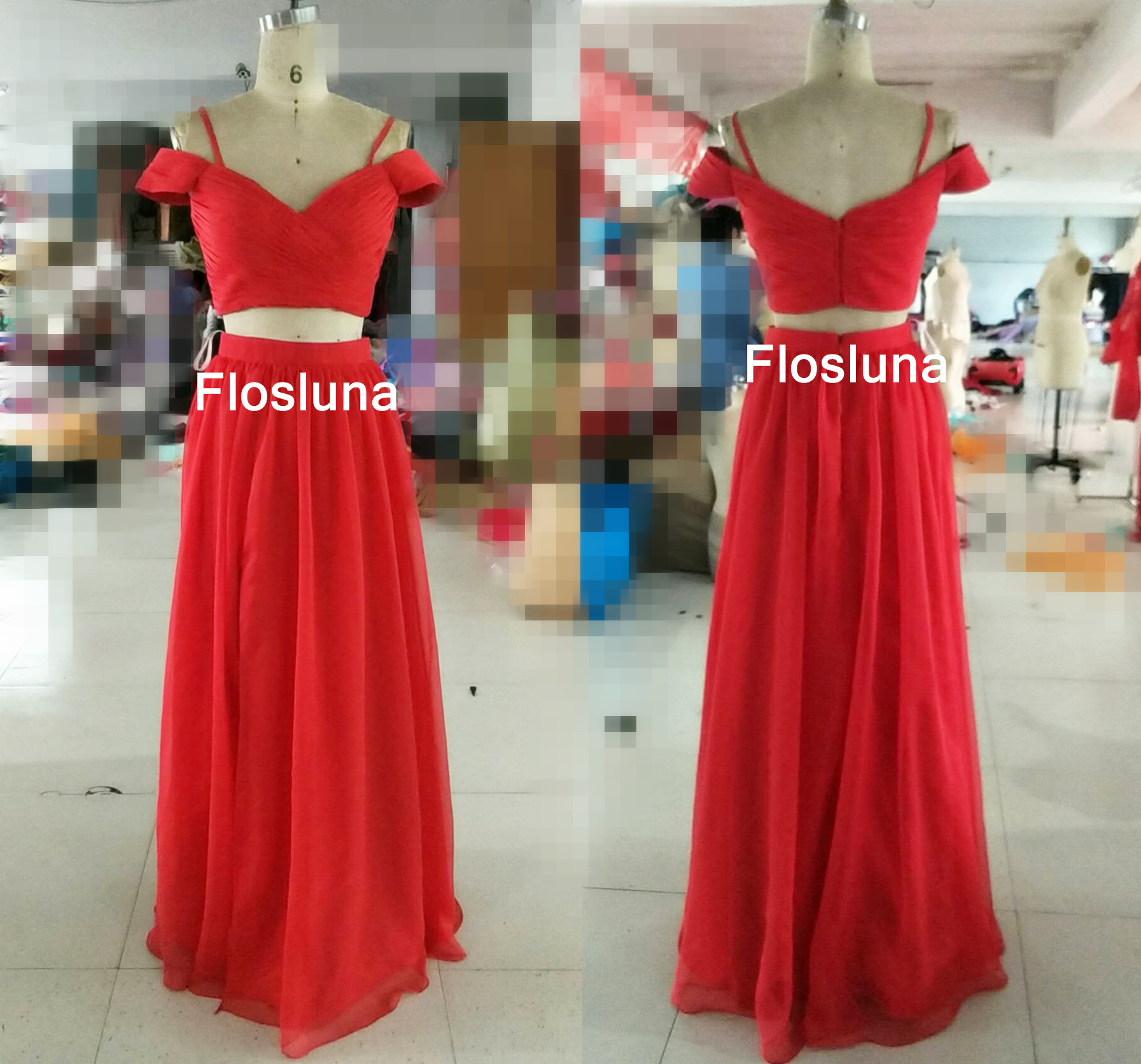 Two Piece Spaghetti Straps Floor-Length Ruched Red Chiffon Prom/Evening Dress