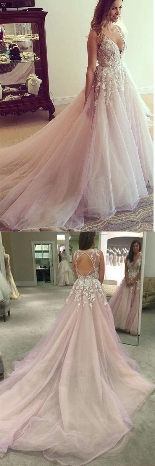 Blush Lace Prom Dress,Prom Dress with Applique,Deep V neck Lace Evening/Graduation Dress,Lace Prom Dress Open Back