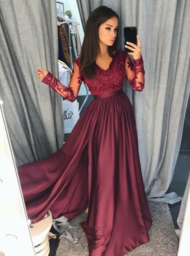 A-Line V-Neck Burgundy Stretch Satin Long Sleeve Prom/Evening Dress with Appliques