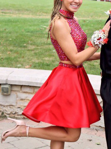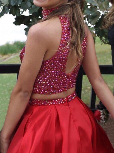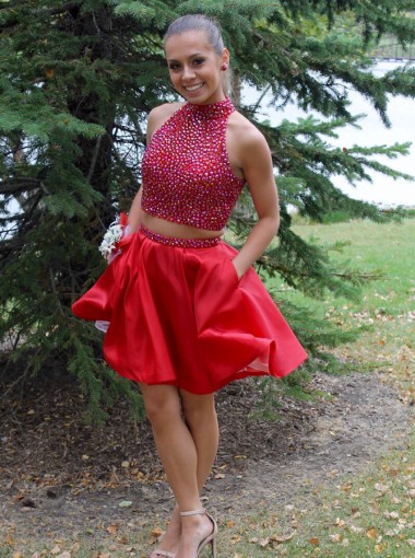 Stylish Two Piece High Neck Short Red Prom/Homecoming Dress Beading with Pockets