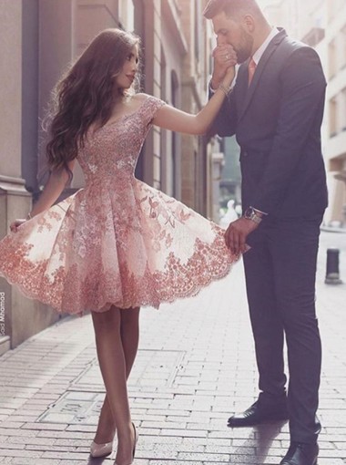 A-Line Off-the-Shoulder Short Sleeves Blush Prom/Homecoming Dress with Appliques