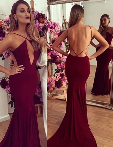Mermaid Spaghetti Straps Backless Burgundy Stretch Satin Prom/Evening Dress