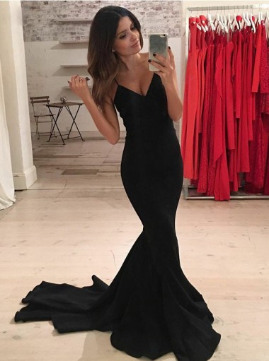 Mermaid Spaghetti Straps Sweep Train Black Elastic Satin Prom/Evening Dress Under 100