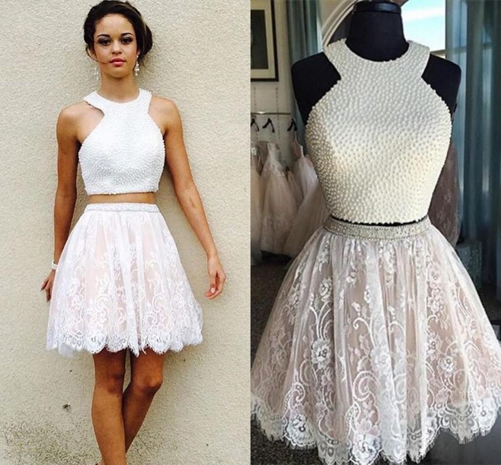 Two Pieces Halter Pearl Beaded White Lace Homecoming Dress,Lace Party Prom Dress