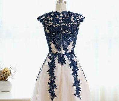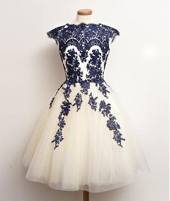 Navy Blue Lace Tulle Short Homecoming Dresses,Capped Sleeves Vintage Lace Short Prom/Homecoming Dresses