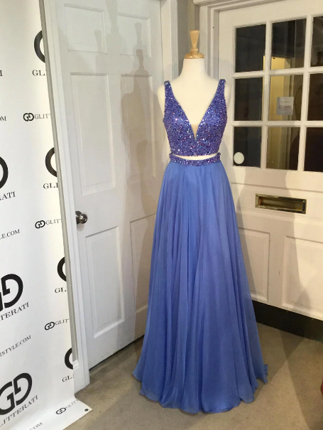 V Neck Two Pieces Rhinestone Prom/Evening Dress,Sexy V Neck Beaded Prom Evening Gowns
