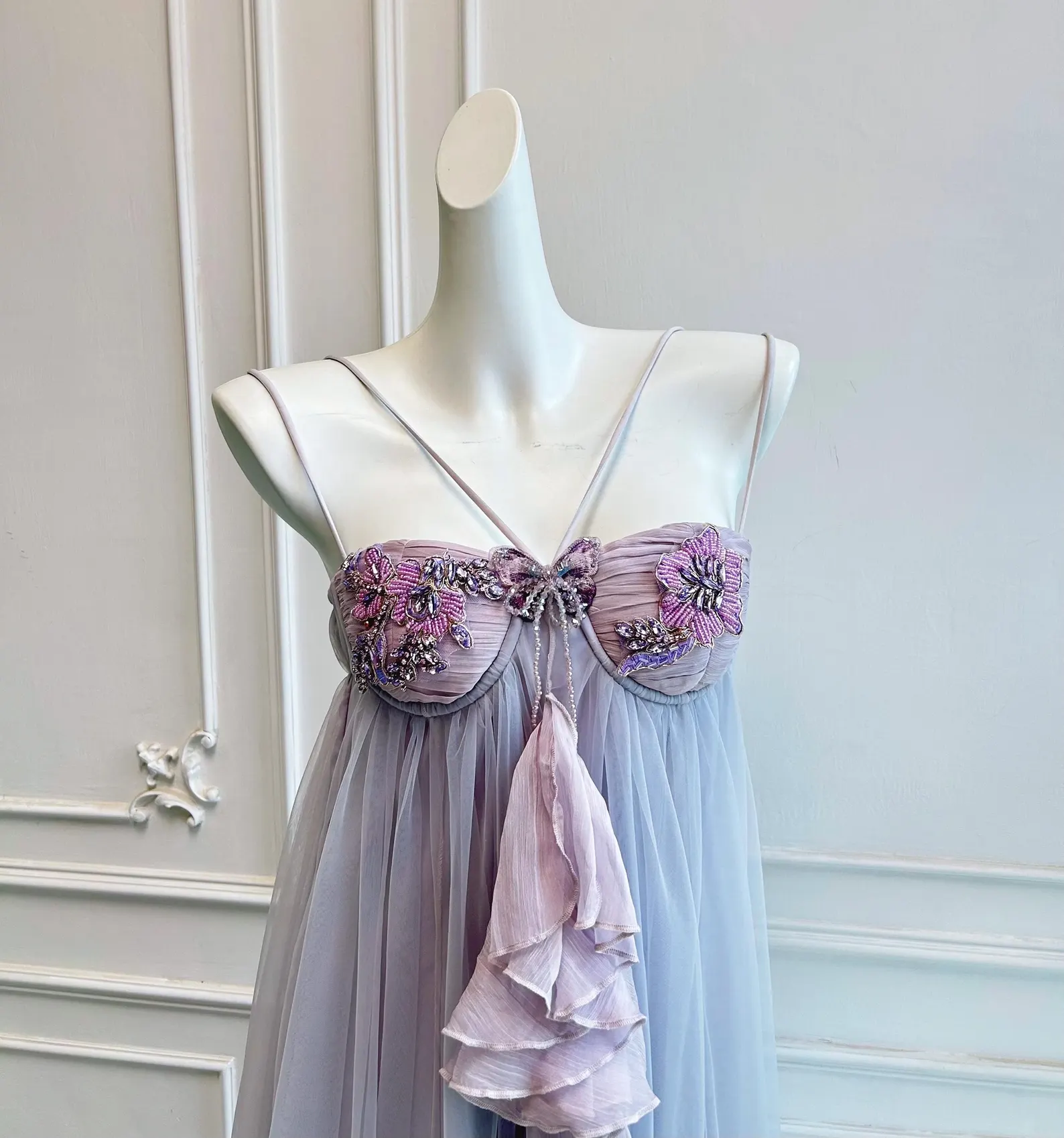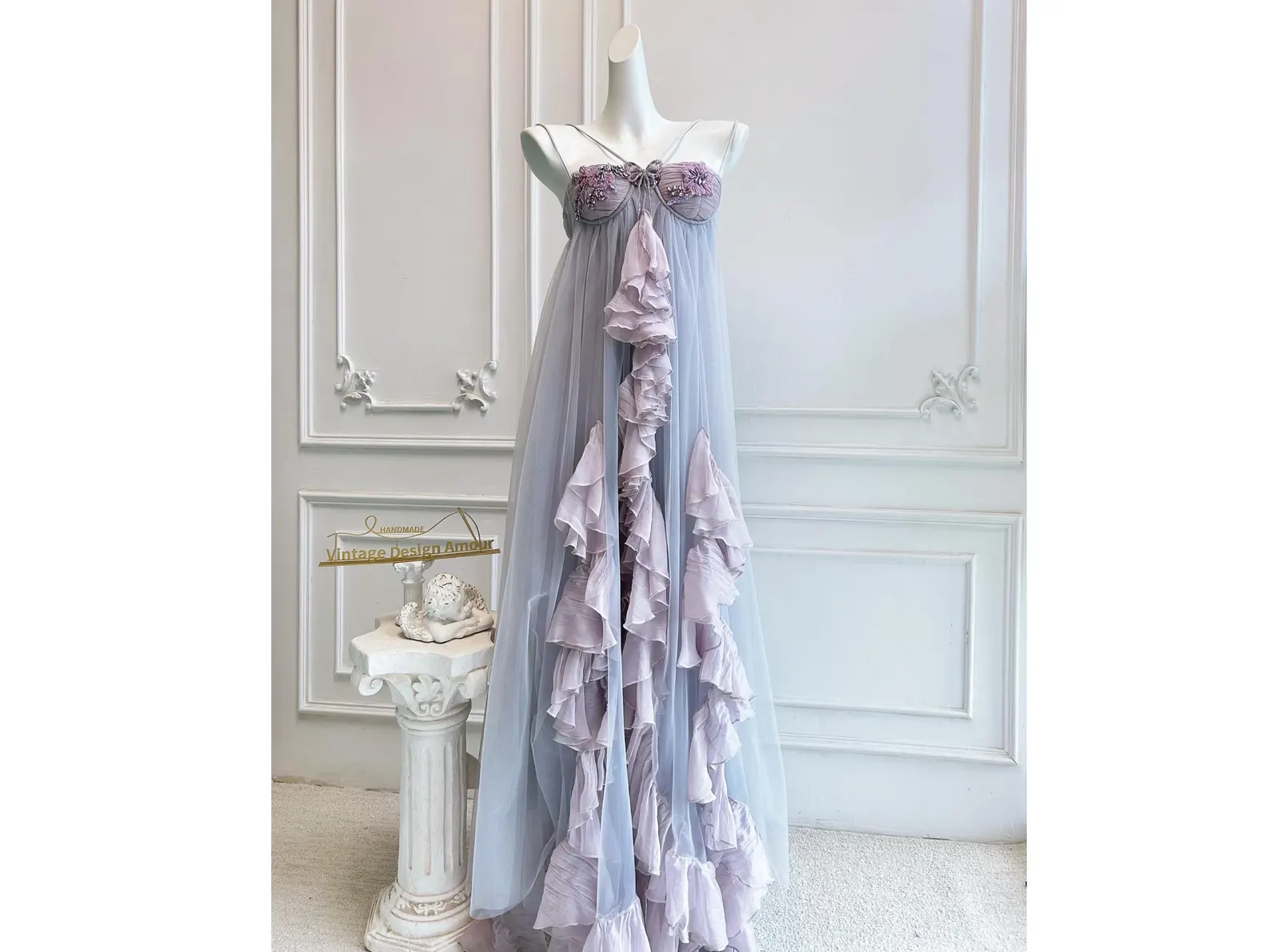 Vintage Lavender Beaded Gown with Ruffle Tulle Overlay , Handmade Boho Maxi Dress for Special Occasions